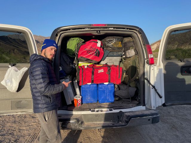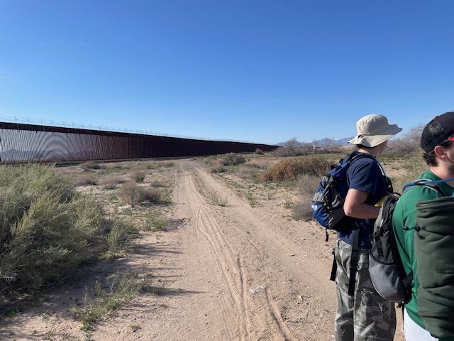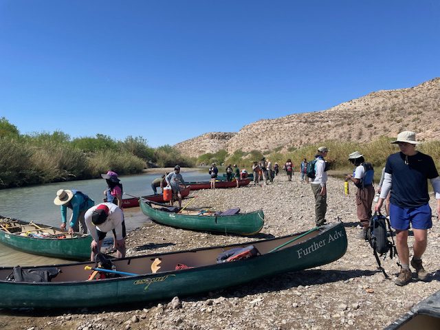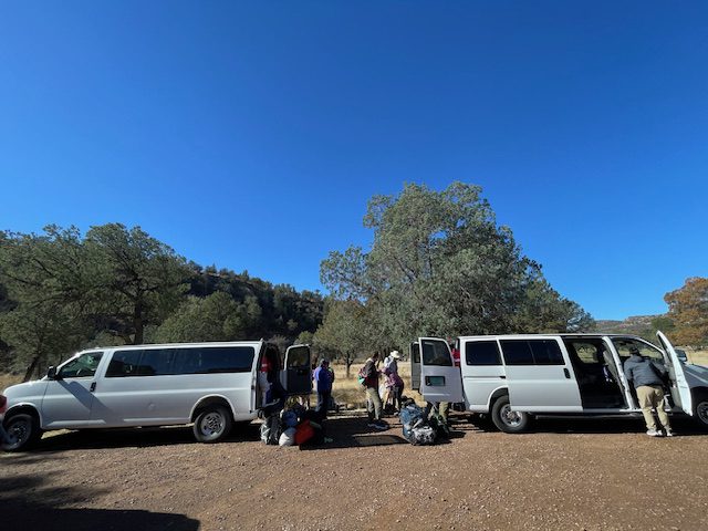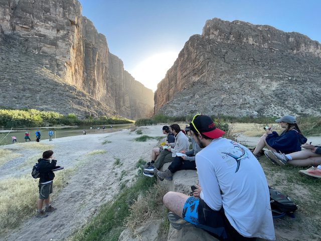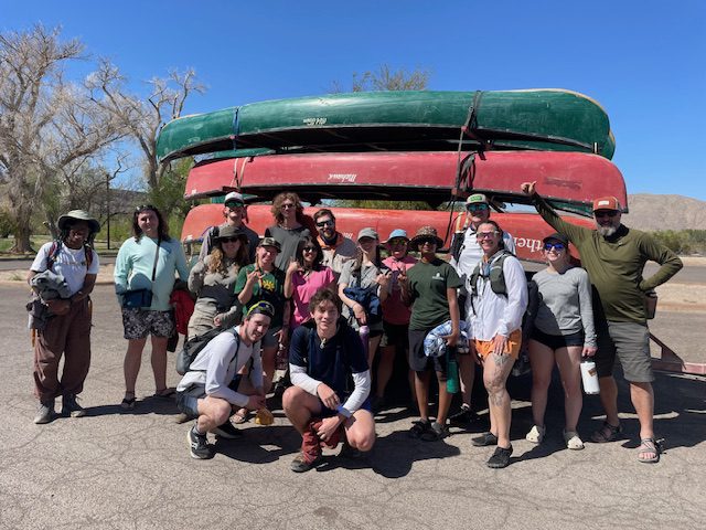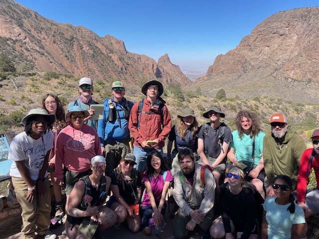 Jake Armour and Dr. Sandra Clinton took 15 DEEGS students on an 8-day tour of the Camino Real through Southern New Mexico and West Texas for Spring Break.  This trip was the primary component of our ESCI 3310 National Parks: The Science Behind the Scenery experiential learning course.  Students flew into El Paso, TX where they were picked up in two 15-passenger vans preloaded with group camping gear and food for a week!  The first stop was a burrito lunch at a famous local spot, then over to the Rio Grande Bosque Park where we were introduced to the River, its unique Ecology and its relationship to the US/Mexico Border Wall.  This was followed by an afternoon trip up to the Franklin Mountains Urban Wilderness Area and State Park, where students could stand at the intersection of the Rocky Mountains, Basin and Range, and the Rio Grande Rift to contemplate the unique corridor that is the Camino Real.