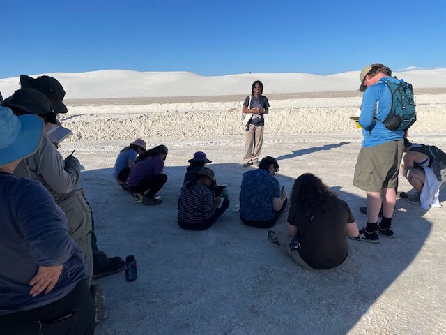We spent our first night camping in the park under beautiful stars, the hoot of owls and the call of coyotes!  The days that followed found the students camping, cooking, and exploring numerous unique destinations across southern New Mexico and West Texas.  These include iconic sites like White Sands, Carlsbad Caverns, Guadalupe Mountains, and Big Bend National Parks as well as a number of National Forests, National Monuments, State Parks, and Preserves.  The students were able to view and engage with a variety of cultural, ecologic, and geologically distinct areas as well as see first hand some of the challenges that accompany them.  These experiences were recorded by the students through Tour Guides, Field Notes, and Photo Essays they complete during the semester.